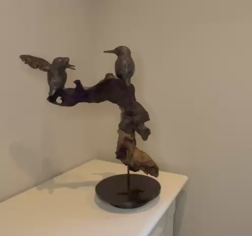 Paperclay met bronslook, aquariumhout, metalen voet.