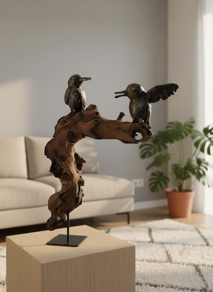 Hout met beeldjes van ijsvogels "Vleugels van vertrouwen"