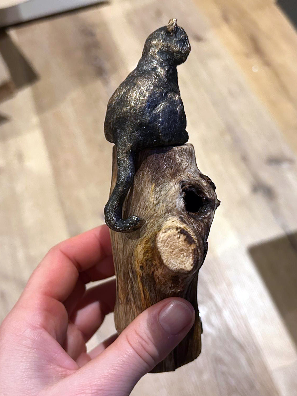 Waar de Kat Waakt is een klein, handgemaakt sculpturaal werk waarin rust en alertheid samenkomen. De kat zit hoog op een stuk eikenhout, stil en aanwezig, alsof hij zijn omgeving aandachtig observeert. Het hout draagt sporen van tijd en natuur en vormt een stevige, eerlijke basis voor het beeld.